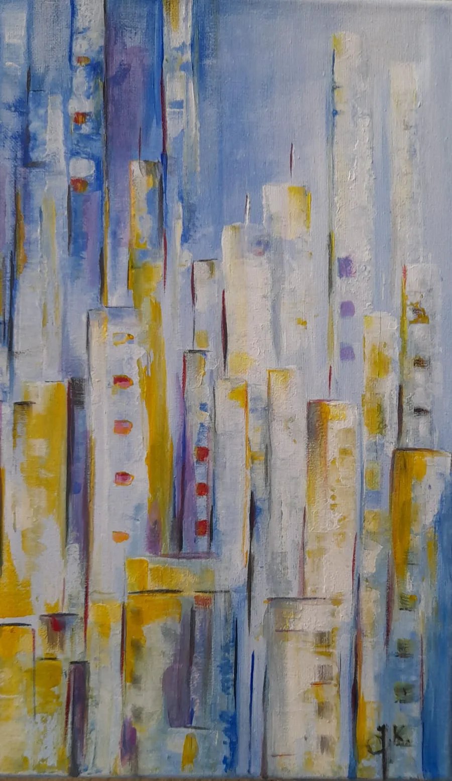 Nowoczesna kompozycja inspirowana rytmem miejskiej architektury. Smukłe, pionowe formy przywodzą na myśl sylwetki budynków, tworząc dynamiczny, uporządkowany układ. Jasna, chłodna paleta błękitów i bieli została przełamana ciepłymi akcentami żółci i subtelnymi detalami kolorystycznymi, co nadaje pracy lekkości i współczesnego charakteru.