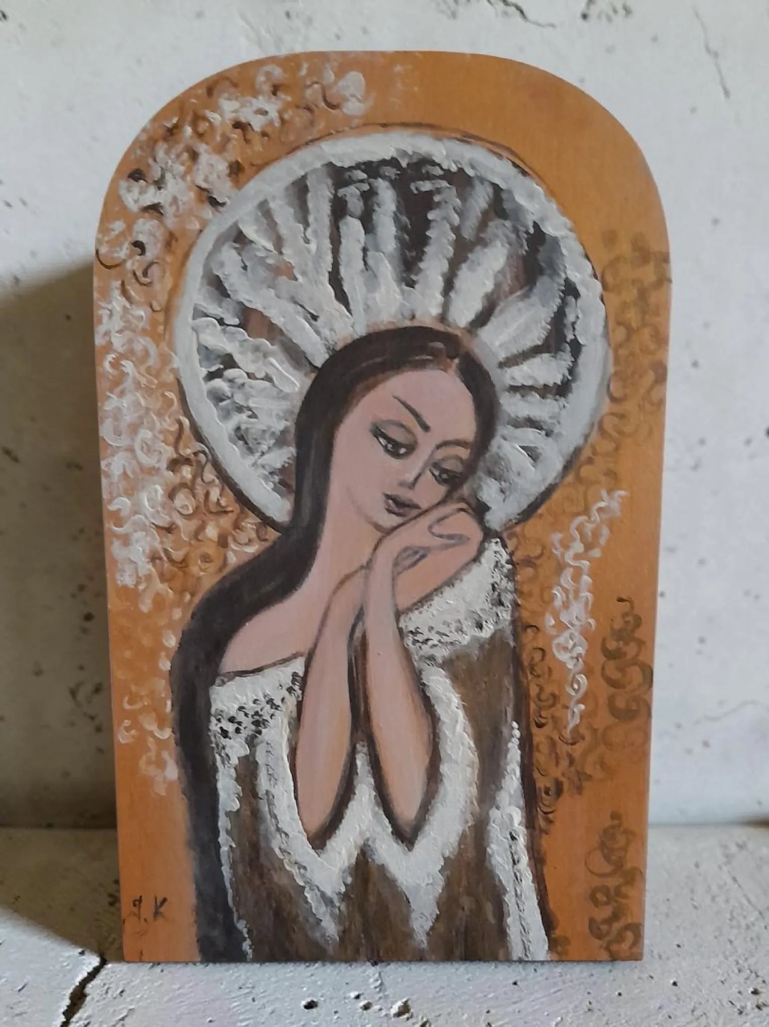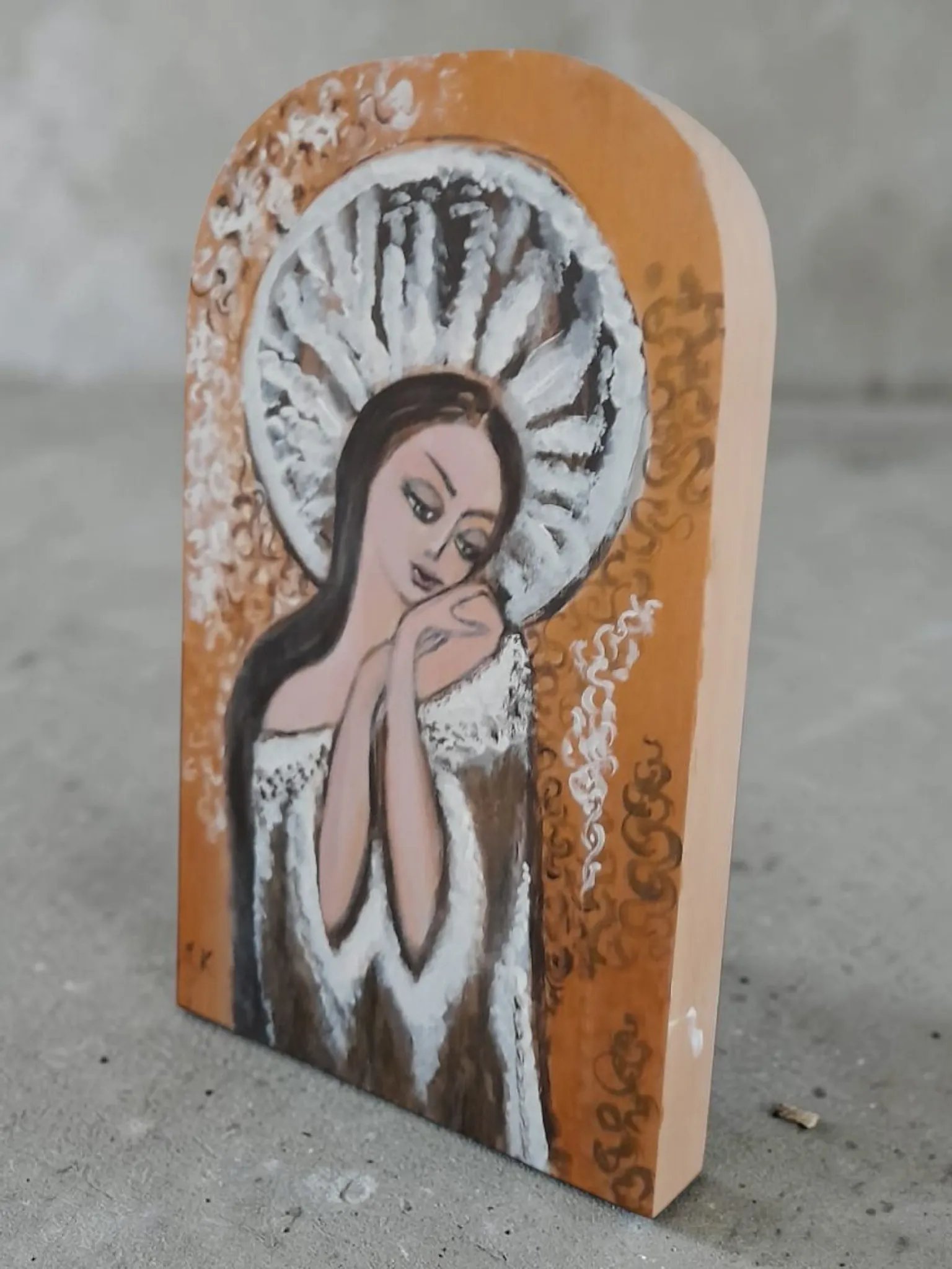 Jasne, świetliste zdobienia i subtelna faktura nadają pracy lekkości, a ciepłe odcienie złota i beżu wprowadzają do wnętrza harmonię i spokój. Zaokrąglona forma deski przywołuje skojarzenia z nowoczesną ikoną – prostą, ale pełną znaczenia.