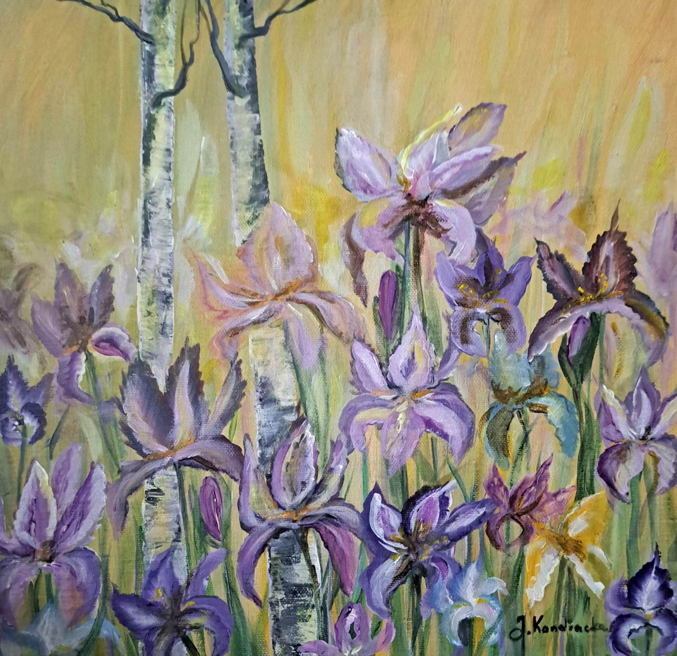 Irysy to nastrojowy obraz inspirowany motywem kwiatów ogrodowych, utrzymany w chłodnych fioletach i zieleni, przełamanych ciepłym, rozświetlonym tłem. Swobodne, malarskie pociągnięcia pędzla nadają kompozycji lekkości i naturalnego rytmu, przywodząc na myśl letni ogród i spokojny kontakt z naturą.