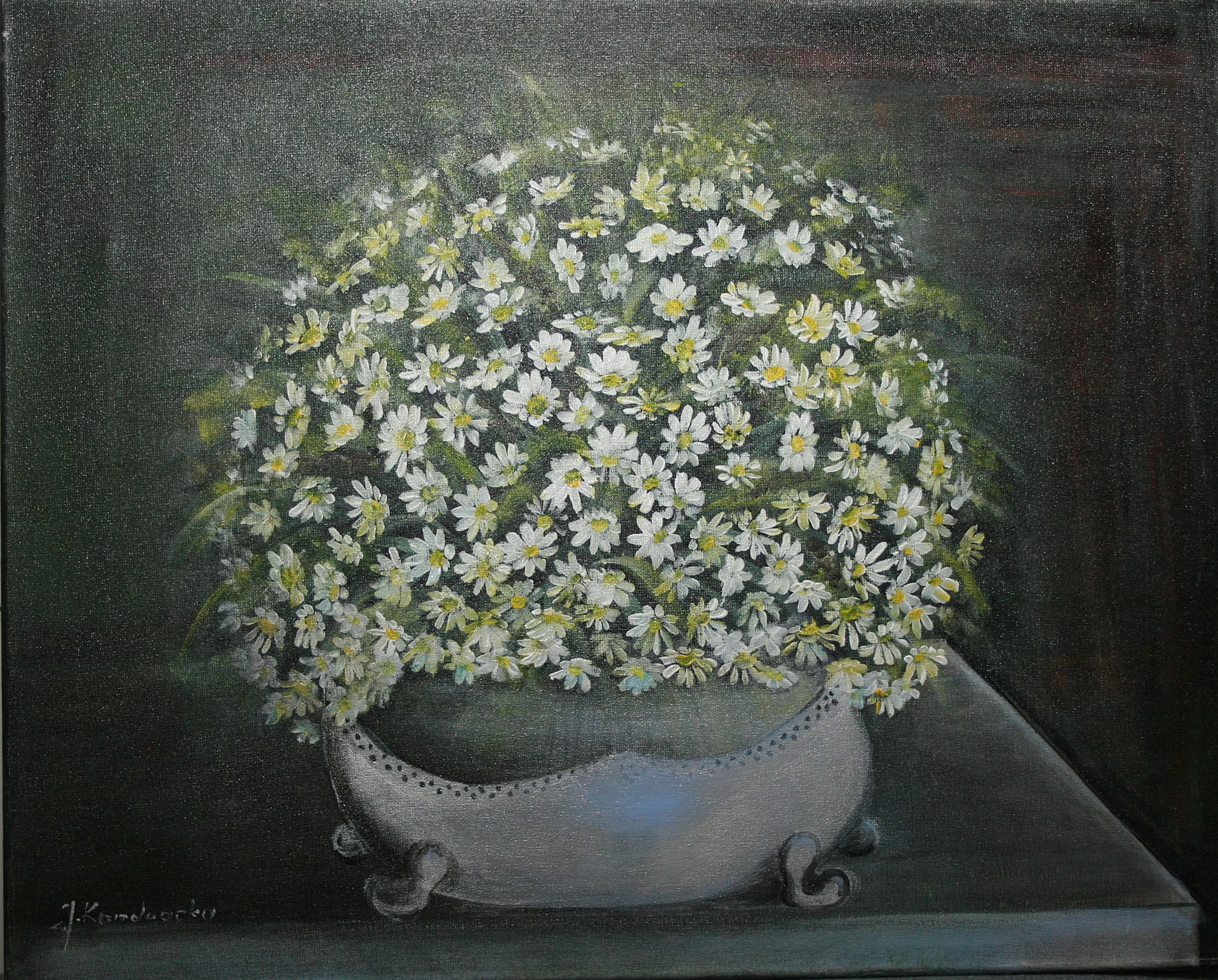 Obraz przedstawiający bukiet polnych kwiatów w ceramicznym wazonie. Praca utrzymana w stonowanej, harmonijnej kolorystyce, z dużą dbałością o detal i światło. Kompozycja spokojna, wyważona, dobrze odnajdująca się we wnętrzach, w których liczy się cisza, naturalność i prostota.