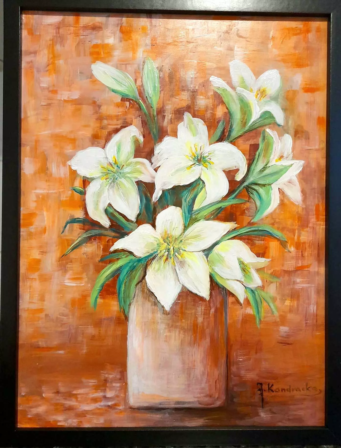 Lilie to dekoracyjny obraz przedstawiający bukiet białych kwiatów na tle ciepłej, energetycznej kolorystyki. Kontrast jasnych lilii z intensywnym, pomarańczowym tłem nadaje pracy wyrazistość i sprawia, że obraz przyciąga uwagę, a jednocześnie pozostaje elegancki i harmonijny.