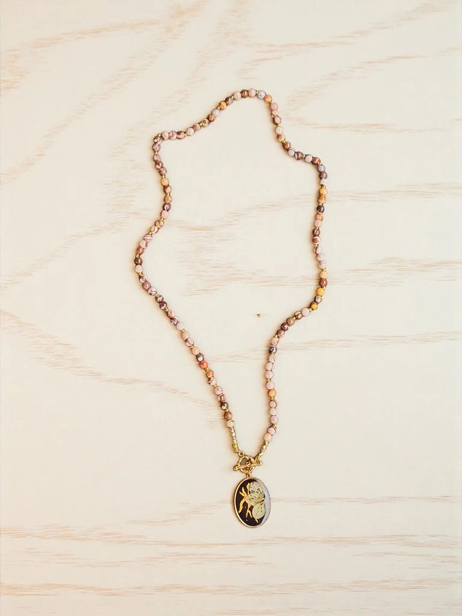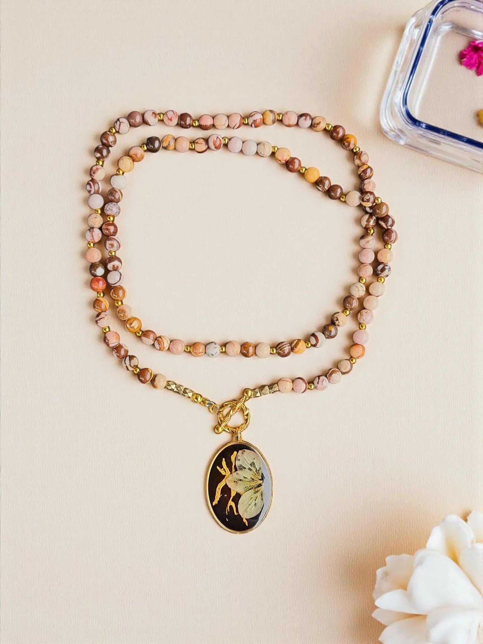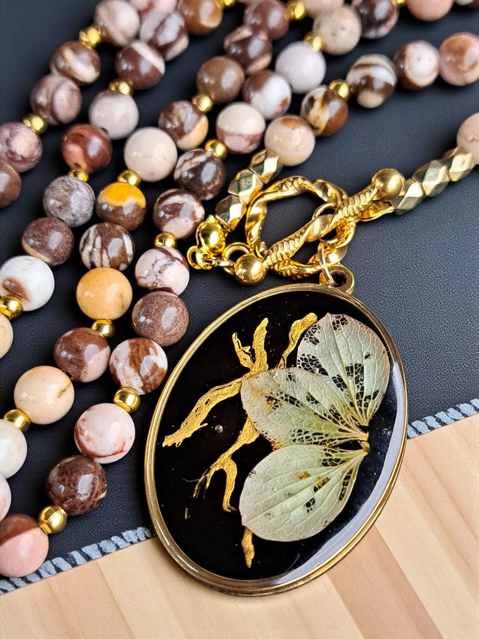 To wyjątkowy egzemplarz, który łączy naturalne piękno kamieni i kwiatów z elegancją rękodzieła – idealny jako prezent lub symboliczna biżuteria inspirowana naturą.