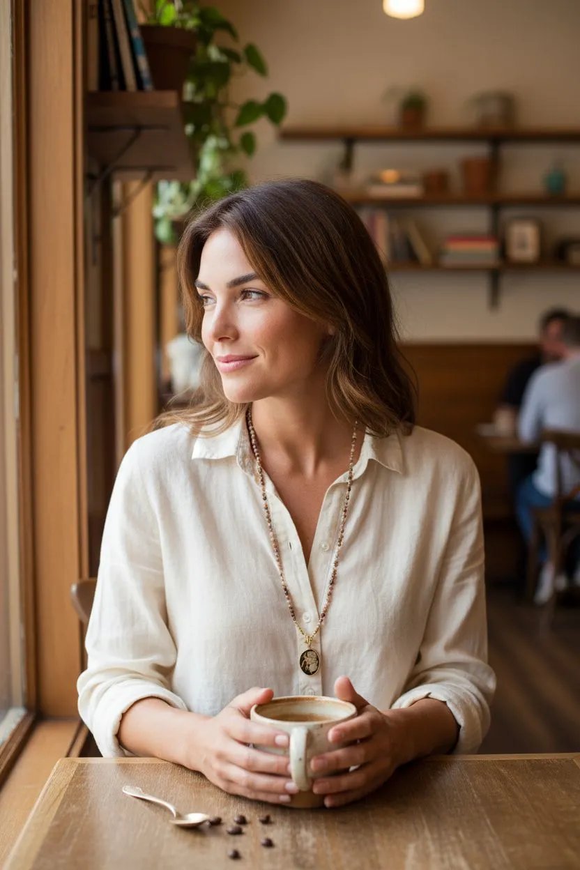 Elegancki naszyjnik o długości 76 cm, wykonany z naturalnych kamieni jaspisu (6 mm) w ciepłych odcieniach beżu, brązu i różu.