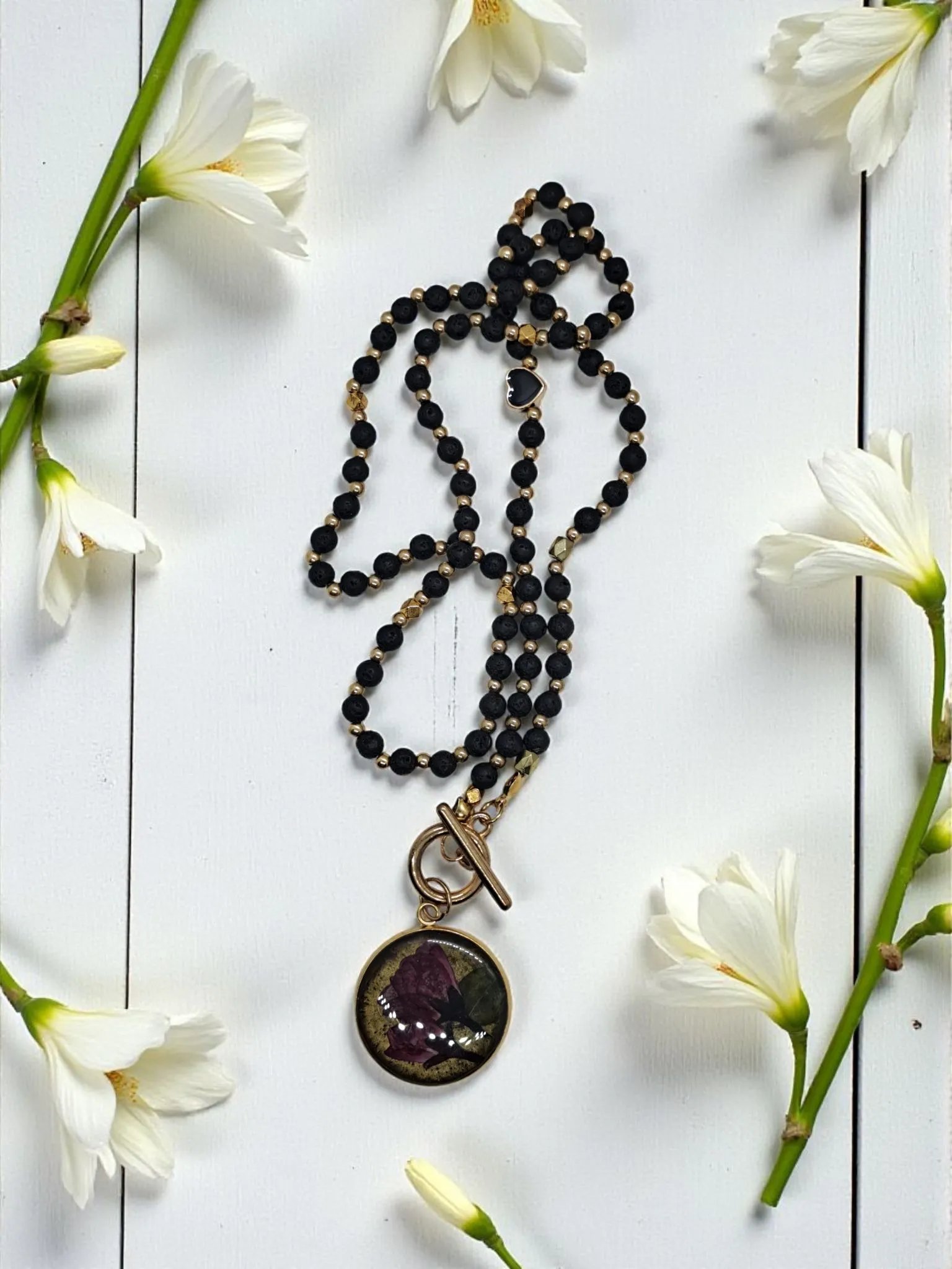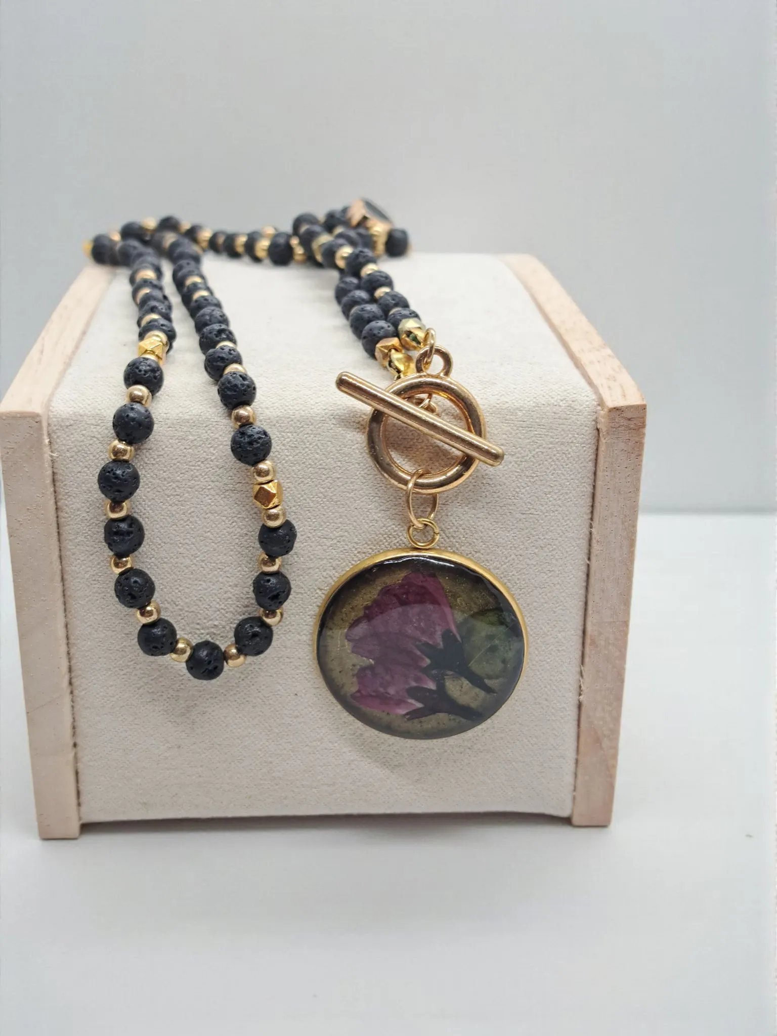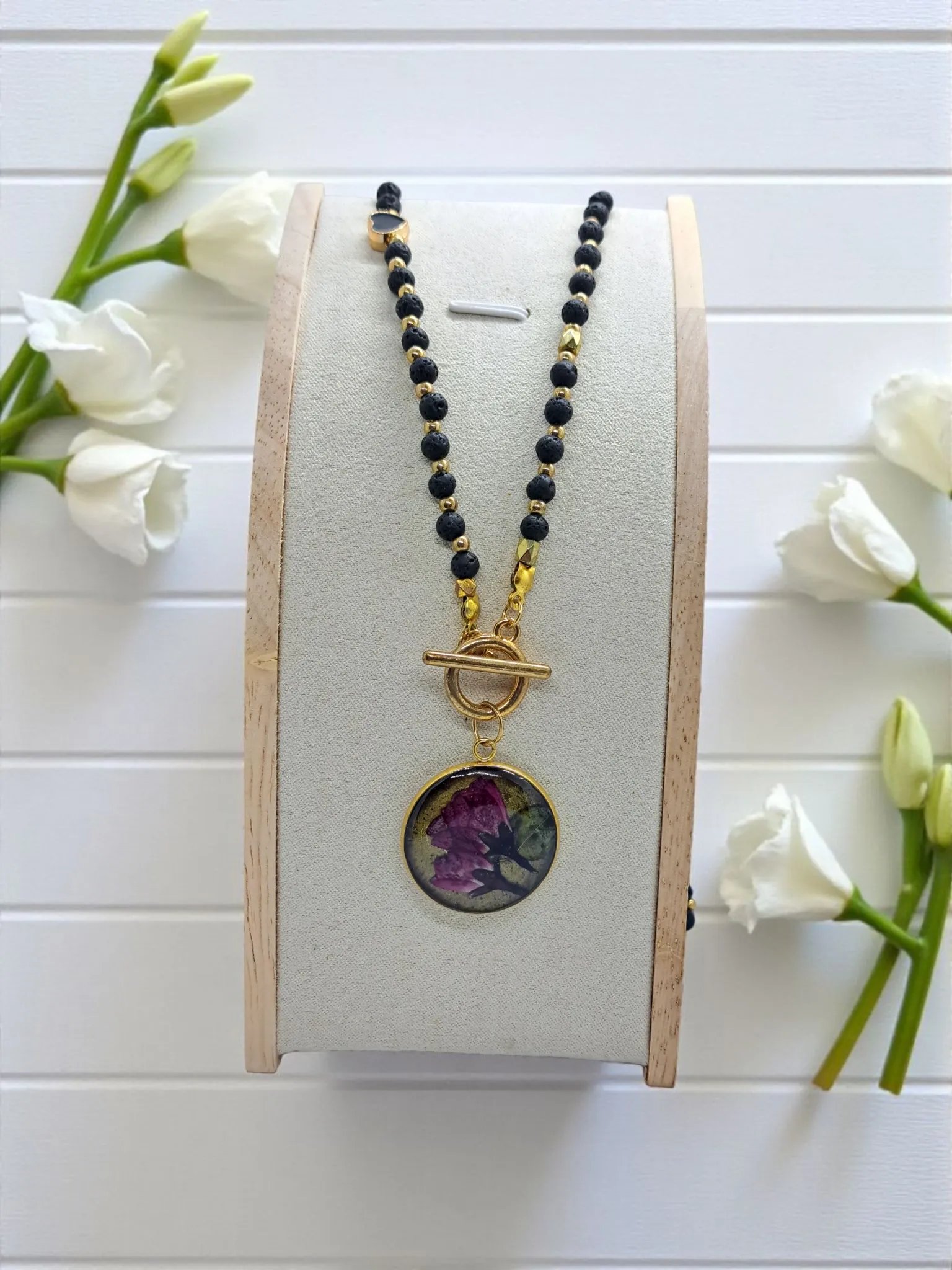 Długość naszyjnika wynosi 57 cm, a zawieszka ma średnicę 3 cm. Każdy egzemplarz pakowany jest w eleganckie pudełko prezentowe – gotowy, by stać się pięknym upominkiem dla miłośniczki natury i ręcznie wykonanej biżuterii.