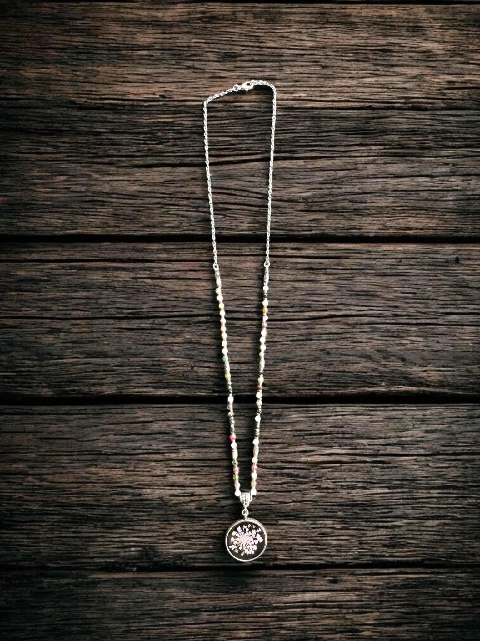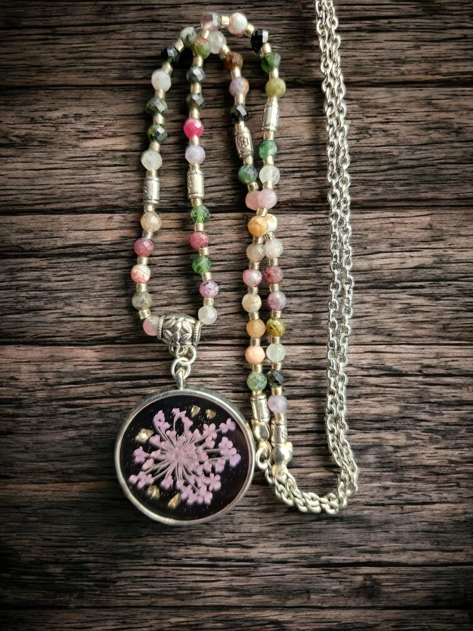 Naszyjnik wykonany z naturalnych kamieni turmalinu. Zawieszka wykonana z żywicy epoksydowej z kwiatem dzikiej marchwi. Naszyjnik jest łączony. Druga część to łańcuszek ze stali nierdzewnej. Całkowita długość łańcuszka 60 cm. Średnica zawieszki 2,7 cm. Pakowany w pudełko prezentowe.