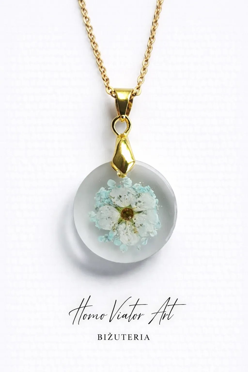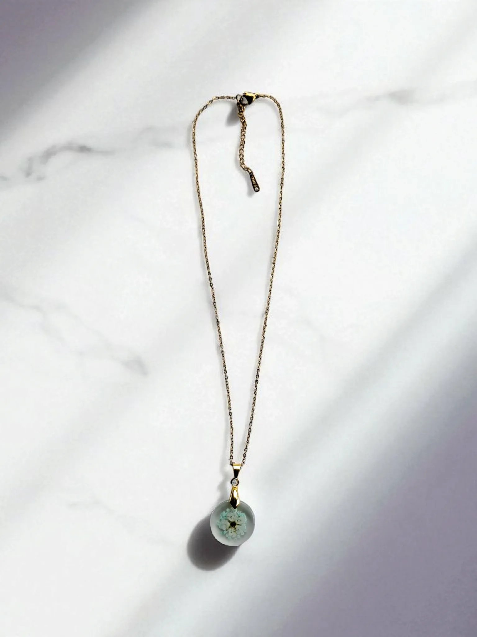 Ręcznie wykonany naszyjnik z zatopionymi naturalnymi kwiatami – delikatną dziką marchwią barwioną na seledynowy odcień i drobnymi kwiatami poziomki.
