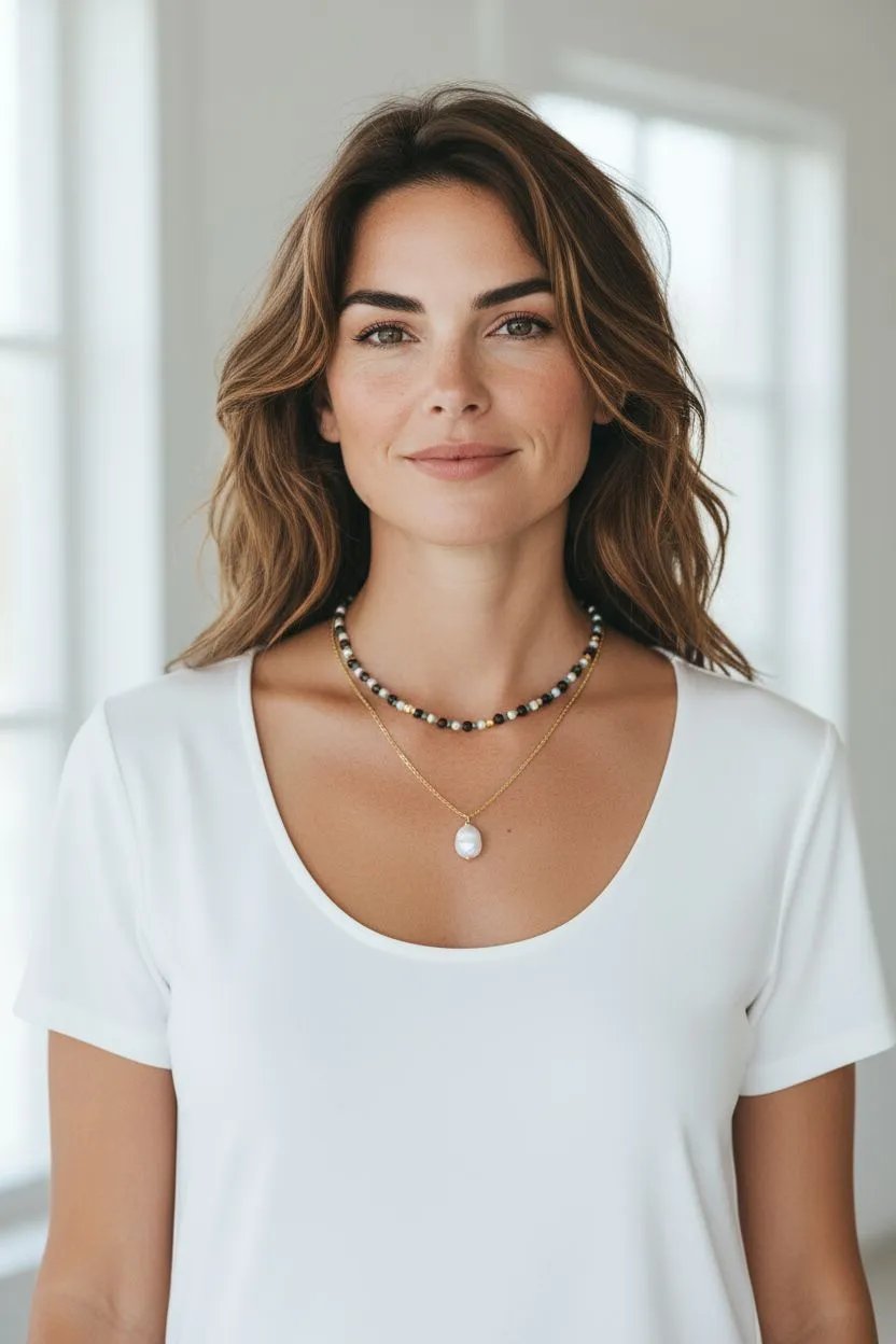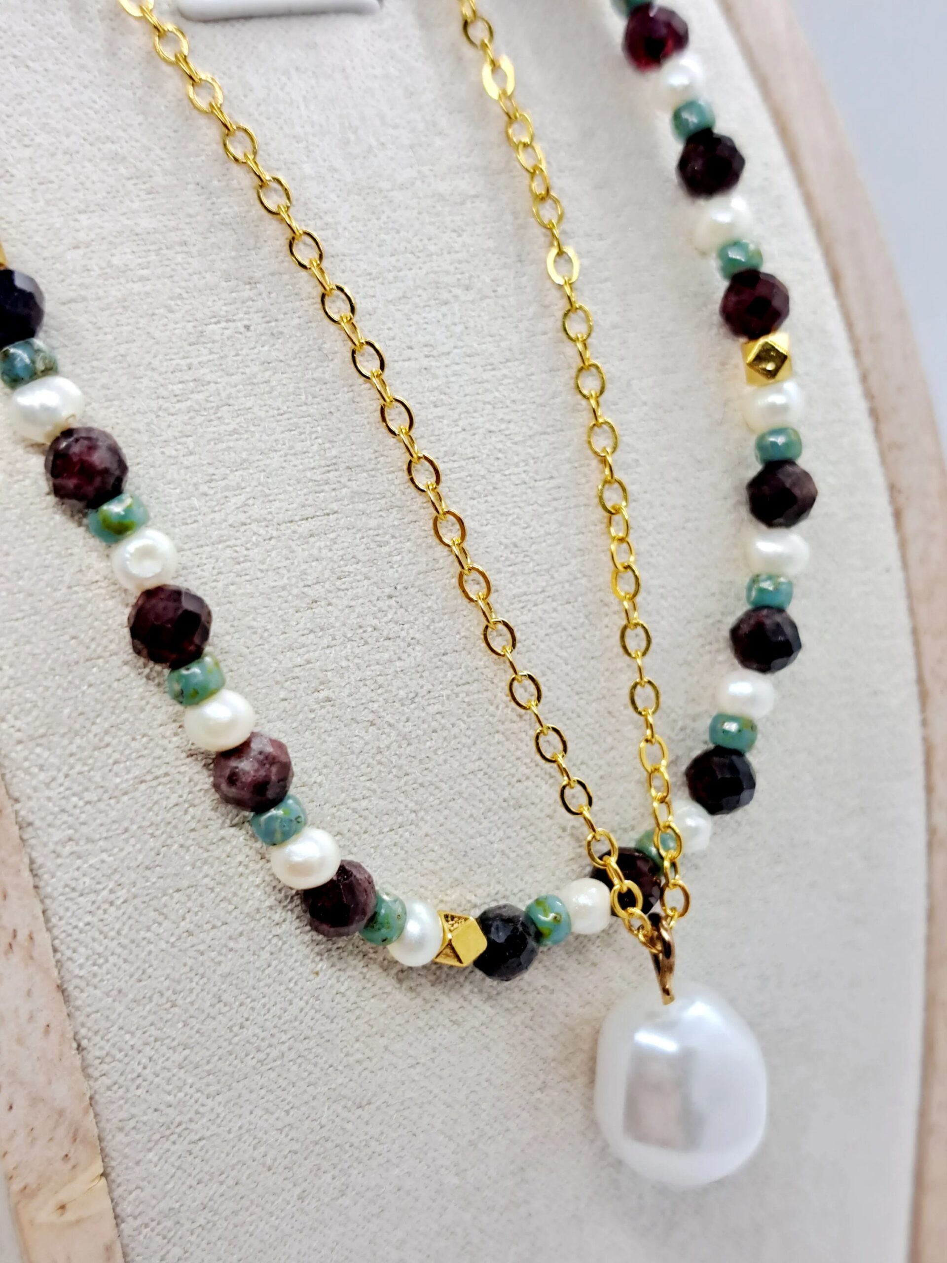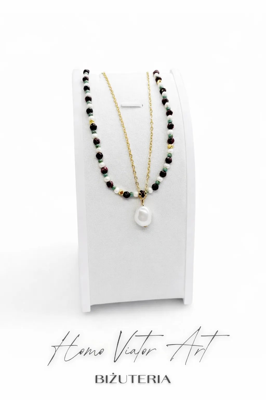 Podwójny naszyjnik łączy elegancję naturalnych kamieni z nowoczesnym akcentem stali chirurgicznej. Pierwszy element zestawu to choker z granatu, ceramicznych koralików i perełek słodkowodnych. Ma długość 40 cm i układa się blisko szyi, tworząc szykowny akcent stylizacji.