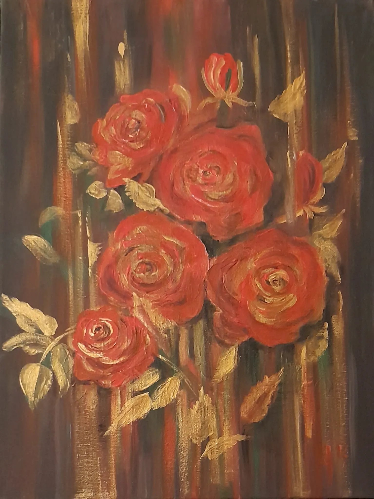 Obraz przedstawia bukiet czerwonych róż utrzymany w ciepłej, nasyconej kolorystyce z wyraźnymi złotymi akcentami. Dynamiczne pociągnięcia pędzla i kontrastowe tło nadają kompozycji głębi oraz dekoracyjnego charakteru.