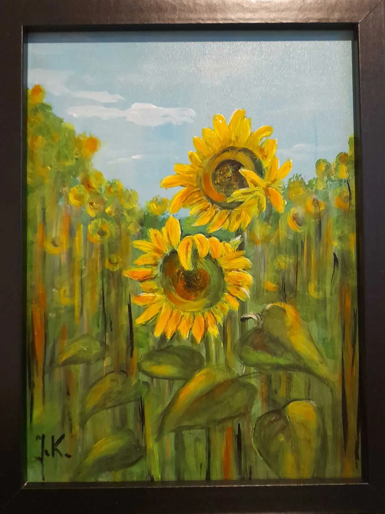 Obraz namalowany akrylami na płycie HDF. Zawerniksowany i oprawiony w czarną ramę.