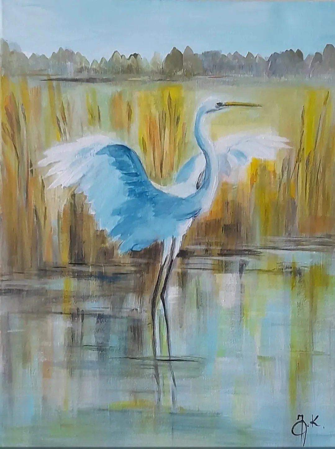 Delikatny, pełen spokoju pejzaż przedstawiający żurawia stojącego wśród trzcin. Obraz utrzymany jest w naturalnej, ciepłej kolorystyce z subtelnymi refleksami światła na wodzie.